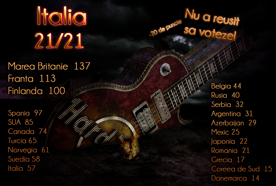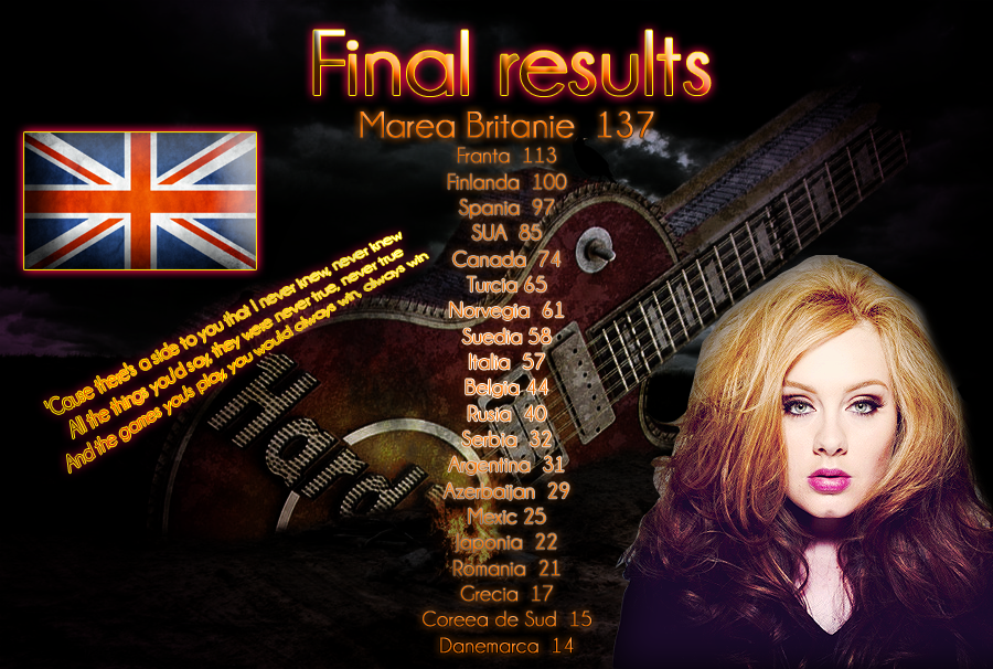 Felicitari UK si de asemenea, felicitari Franta & Finlanda. A fost o editie puternica, in care orice tara din top 3,dupa parerea mea, avea la fel de multe sanse sa castige.