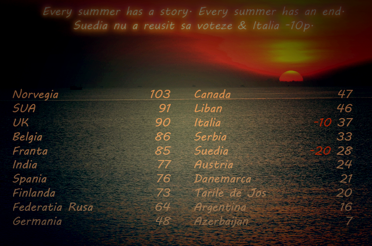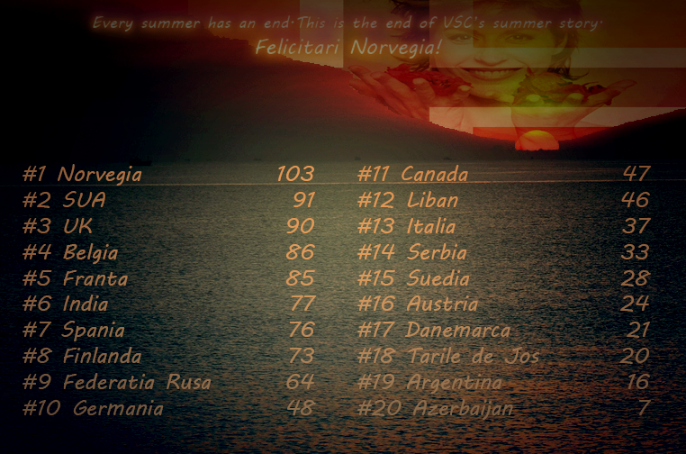 Felicitari coane!! Bravo Norvegia, super piesa. Si bv Gera pentru show, superb as always. Multumesc pentru voturi, Franta in top 5 e genial