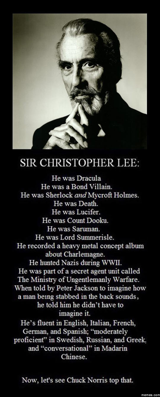 He isĀ also the only person from the LOTR cast to have actually met Tolkien. What a legend. RIP Sir Christopher Lee. Today, the world of cinema lost one of the greatest men of its' history. His memory will live on forever with the masterpieces he took part in.