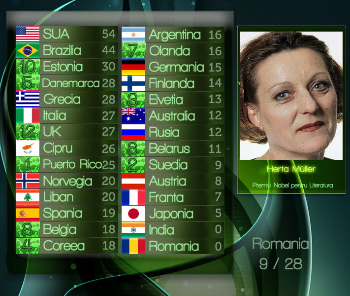 PS: Romania,oficial, nu are niciun premiu Nobel, dat fiind ca toti cei 4 laureati au plecat in alte tari ca sa se poata realiza. Trist angry